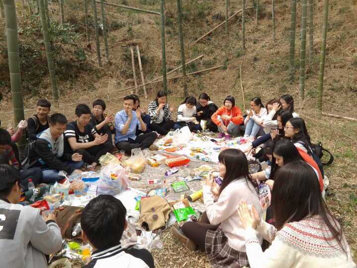 大家都围在一起席地而坐,在两个班班长的主持下,进行了一些互动。先是每个人自我介绍,然后班长点名叫人说出某个人的名字,说不出的要惩罚。小小的游戏,却着实化去了两个班初次见面的羞怯和紧张。吃到差不多的时候,便又开始了一些棋牌游戏,在嬉笑打趣中不知不觉到了3点,虽然不舍,同学们也只好收拾好垃圾,离开此地返回学校了。