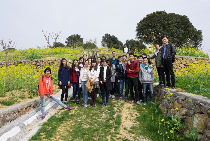 在山顶上来回观览了一段时间后,一位女生提议去远处山脚下的油菜花田看看,大家便有迈开了步子。的确,油菜花田开满油菜花,蜜蜂忙上忙下的样子比起开满樱花的山坡还要可爱几分。两个班的同学便在此处集合起来拍了一张合照。