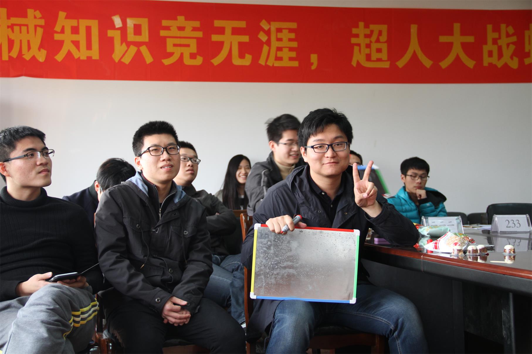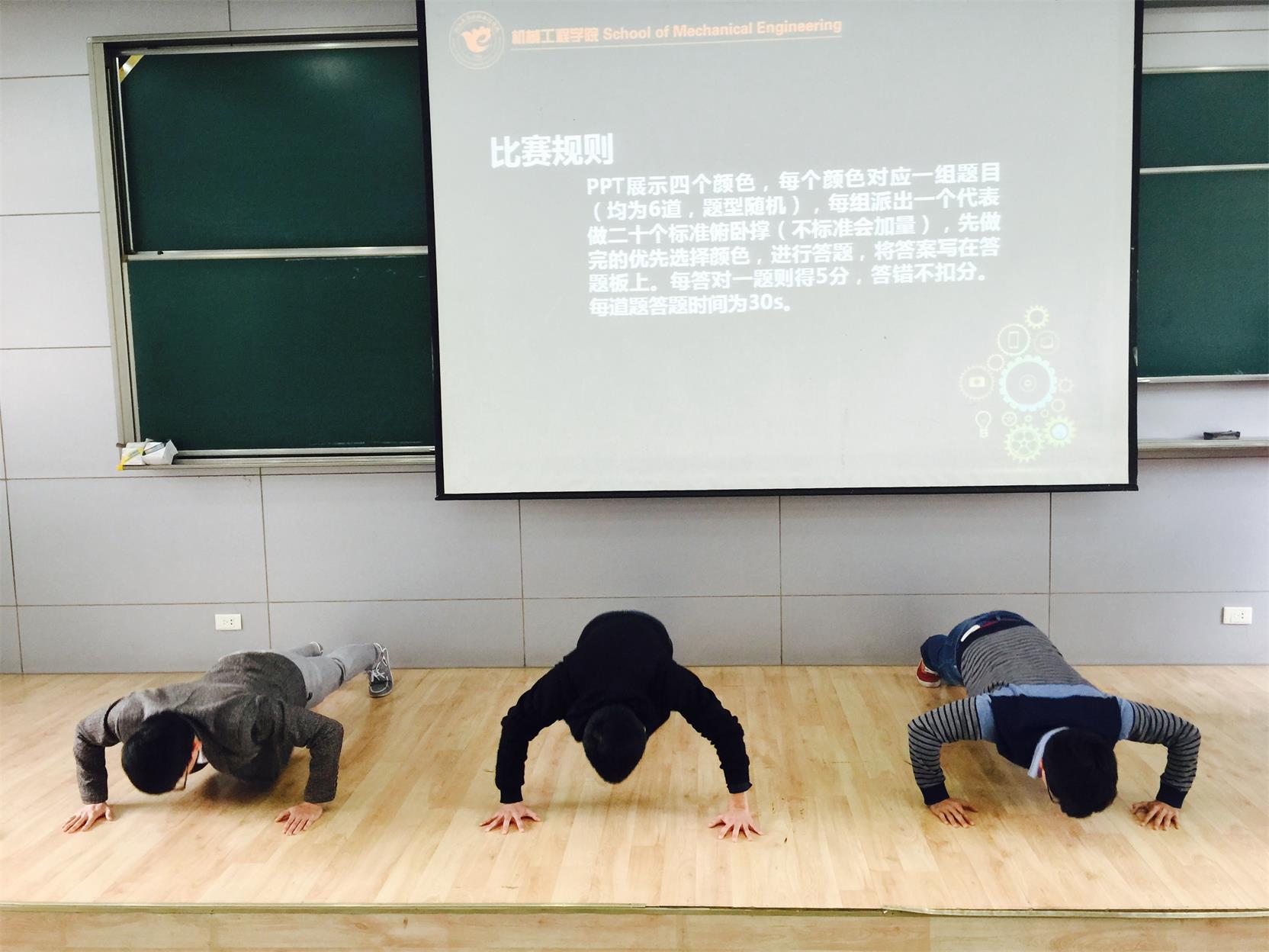 在各支队伍各自向大家介绍了自己的团队组成之后,于轻松的氛围中,趣味知识竞赛正式拉开了序幕。本次知识竞赛由四部分形式不同的比拼组成。其中第一轮的“必答题”环节,每组的代表通过做完二十个俯卧撑的快慢顺序决出了答题顺序,不同队伍依次选择不同题组来答题,每道题答对得五分,答错不扣分。队员们面临的六道必答题有难有易,无一不是与跟机械工程学院的学生息息相关的题目。
