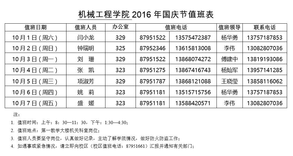 机械工程学院2016年国庆节值班表