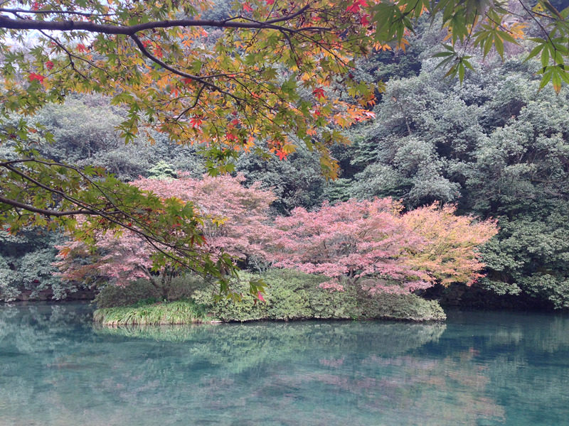 九溪尽头便是九溪烟树,清澈见底的水中倒映的浓烈色彩,仿佛能迸发出无限的生机,似乎又在驳斥这有点凉意的天气。当我们拿出手机想记录这份景色时,得到的照片却都蒙上一层白蒙蒙的雾,也许是手机的像素已经不足以记录这份浓烈了。幽寂宁静,却又有着跳动的活力和浓烈的色彩,难怪张岱能说出“各名胜地寻讨无遗,问及九溪十八涧,皆茫然不能置对。”