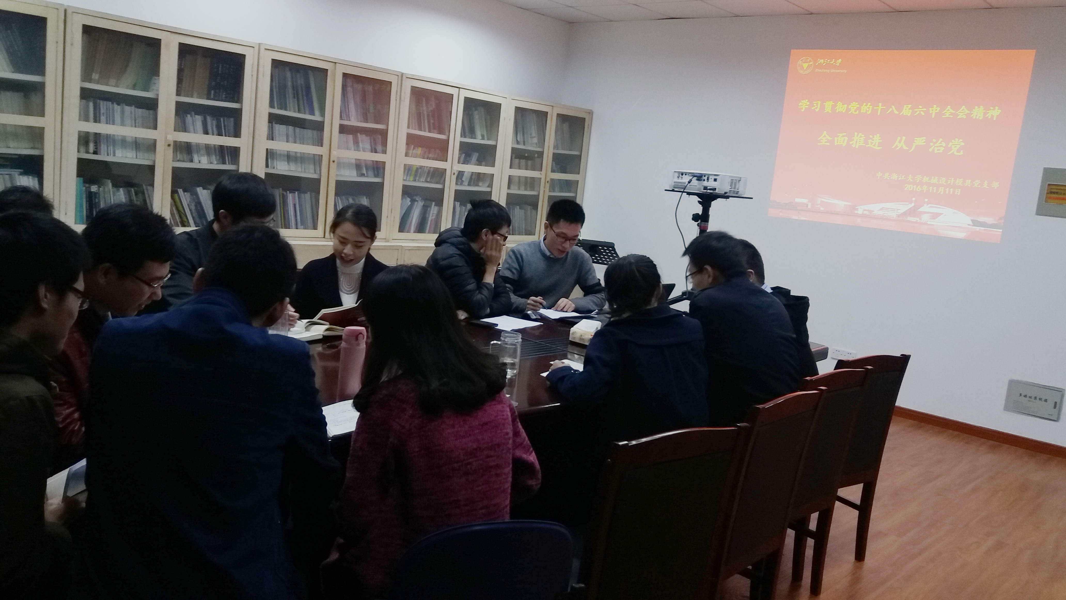 2016年11月11日晚7点,机械设计模具党支部在教一303组织召开了全体党员大会,党支部全体正式党员、预备党员、入党积极分子参加了会议。会议深入学习了党的十八届六中全会精神,原原本本、一字一句研读了《关于新形势下党内政治生活的若干准则》(以下简称《准则》)和《中国共产党党内监督条例》(以下简称《条例》),会议还学习了浙江大学机械系优秀共产党员代表林俊德院士的先进事迹。