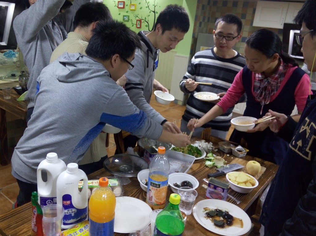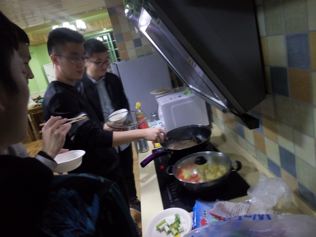 下午16:30左右,大部队陆陆续续地赶到了32舍楼下的毕至居。兵分三路,几个同学开始洗菜、刷锅,在厨间开始忙活,几个同学则在旁边打起了“迷你”麻将,还有一些同学聊起了天,侃起了大山。由于大四以来课程渐少,大家一起上课的时间也就少了,寝室相距较远的同学们平时缺乏沟通,在这一次日租里把攒着的话都说了,正在准备出国深造的同学互相交流着语言考试和申请经验,已经保研的同学一起探讨着实验室的生活和科研进展,在一个小小的房间里,欢声笑语不断,大家的感情也随着电磁炉上的美食一起升温。
