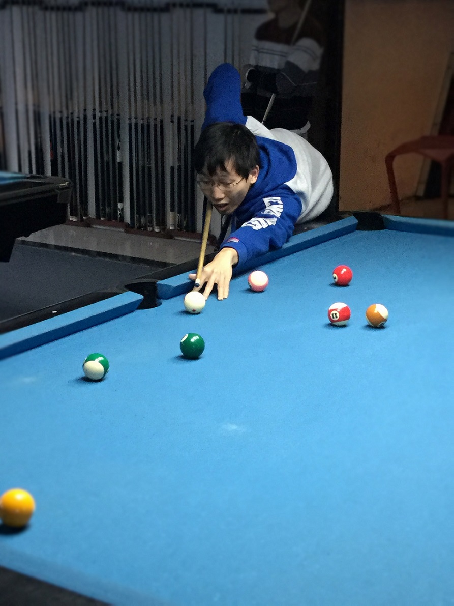 我们团支部的两名台球选手球风迥异,各有特色。郑鑫隆球风成熟稳重,古语有云:“心有波澜而面如平湖者,可拜上将军”之人,属此类;董卓伟球风则欢脱吊诡,不拘泥于常规。