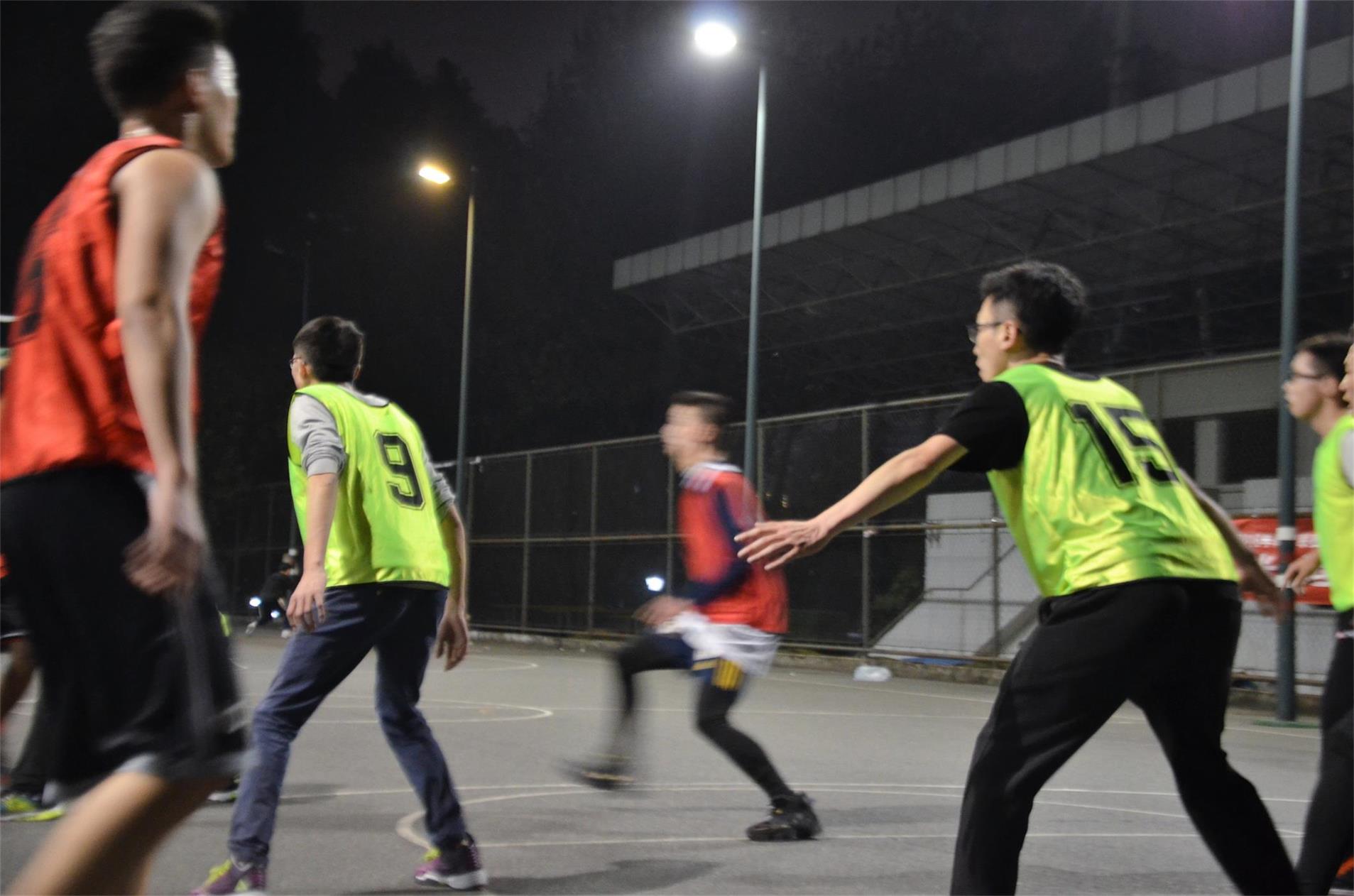 第一场比赛开始之前,双方球员经过短暂的赛前热身后都热情高涨、跃跃欲试,球场周围也围满了前来呐喊助威的同学们。随着裁判一声哨响,双方队员便开始了紧张激烈的对抗。过了不久,机械工程1404的队员迅速发力、积极进攻,率先打破僵局,并在接下去的比赛中始终保持勇往直前的强劲势头。然而,身穿绿色球衣的工业工程队伍也不甘示弱,第二节将比分赶超。中场结束,两队比分为16:23。