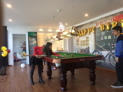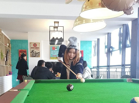 打台球时,大家切磋彼此的球技,也热心地指导妹子们。