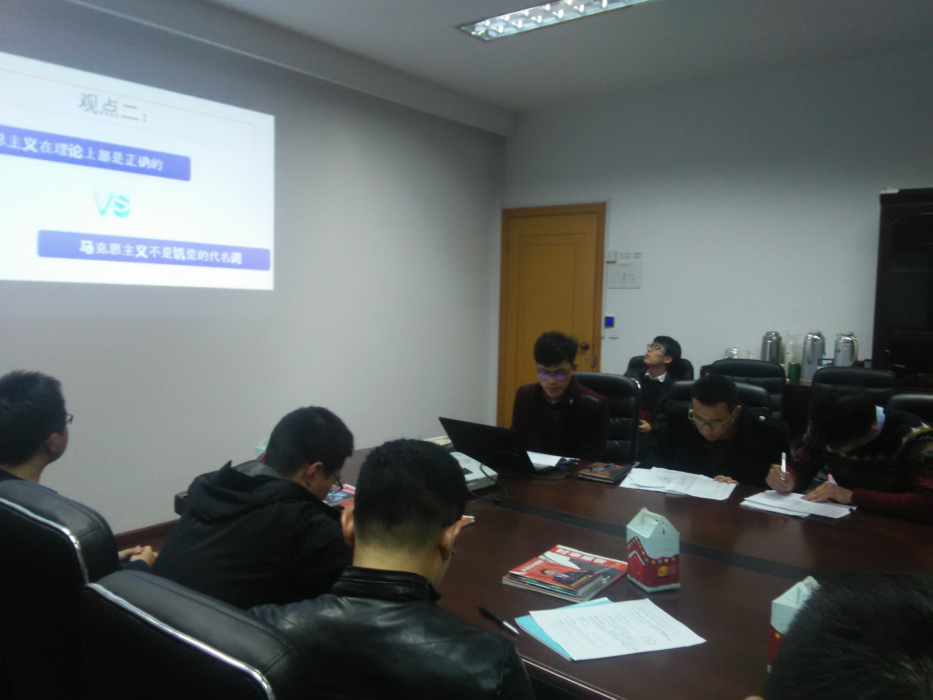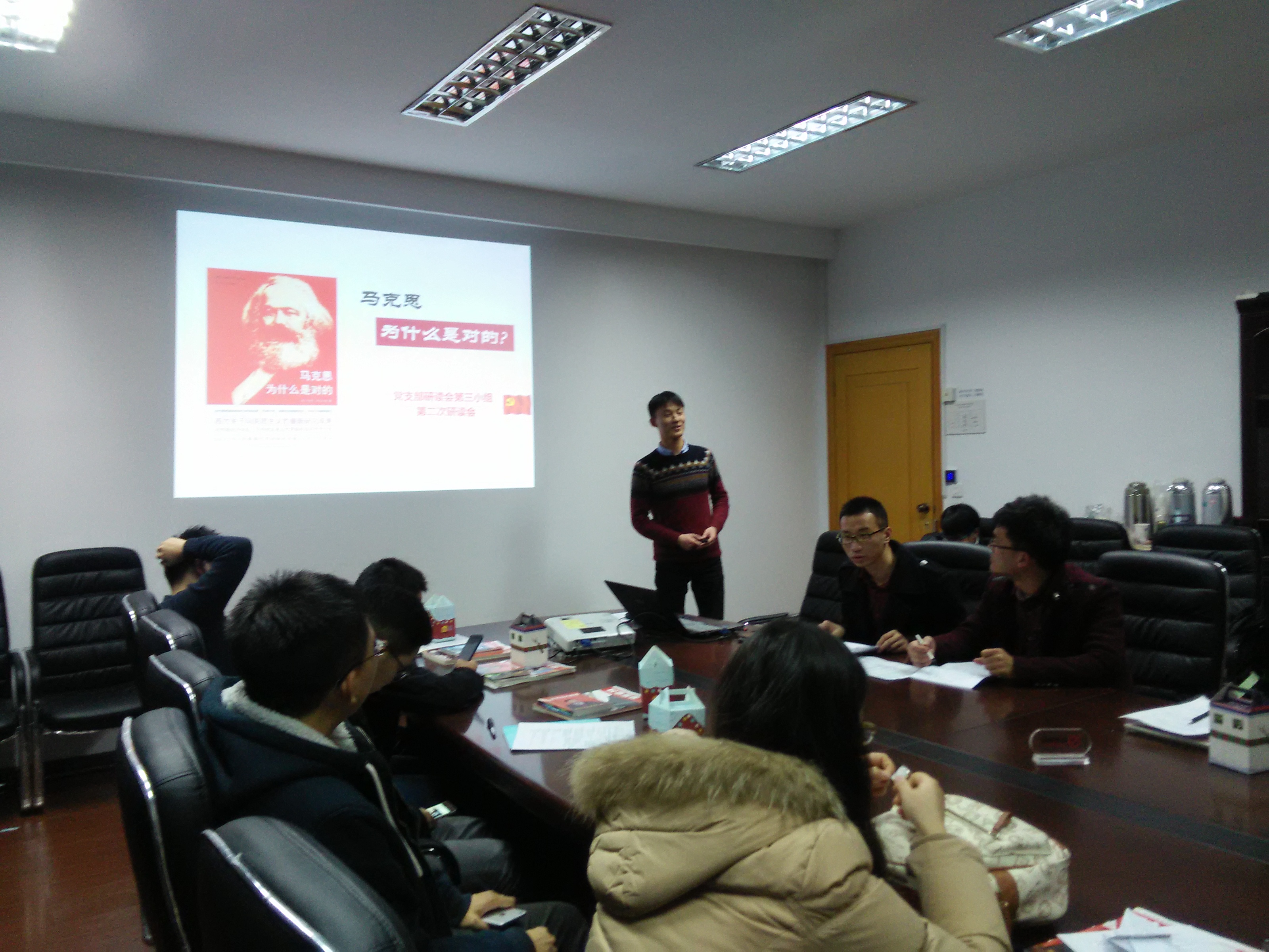 “马克思主义到底有没有过时呢?”机械16硕2支部(副)书记朱峰和机电16硕2支部书记杜双龙作为本次培训大会上著作研读分享会的分享嘉宾,同大家一起分享了《马克思为什么是对的》一书的读书心得。分享会上各支部(副)书记纷纷就马克思主义对当今中国政治形势产生的影响发表自己的观点。“资本主义最终制约的是资本主义本身,马克思主义并没有过时,过时的是资本主义。我们不应该被资本主义的糖衣炮弹击中,要时刻保持清醒。”