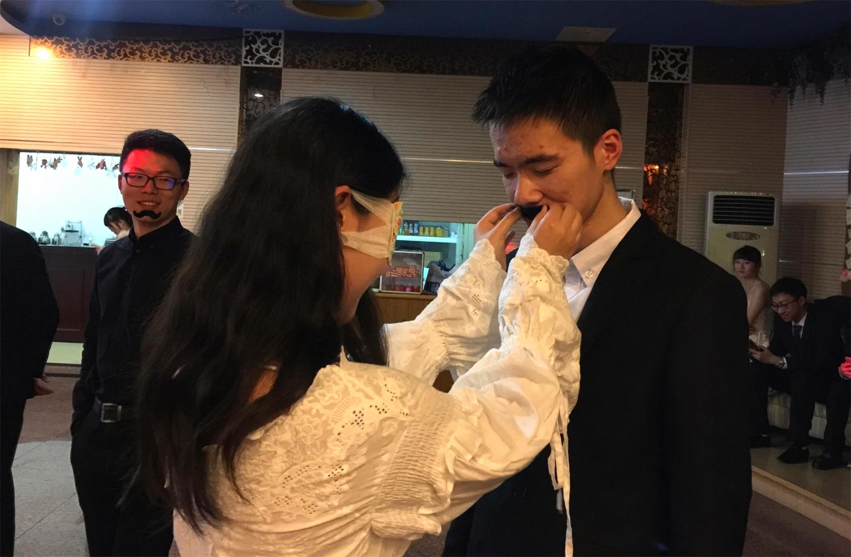 一曲终歇,主持人又邀请大家在舞池边休息的大家参与到一个贴胡子的小游戏中来,试一试自己与舞伴的默契程度。很快七队舞伴主动来到了场上,由女生蒙上眼睛,在男生的指引下,一步步前移靠近把小胡子贴到自己舞伴的脸上。几番尝试后几队男生脸上歪歪扭扭的胡子惹得摘下眼罩的女生不禁笑起来。