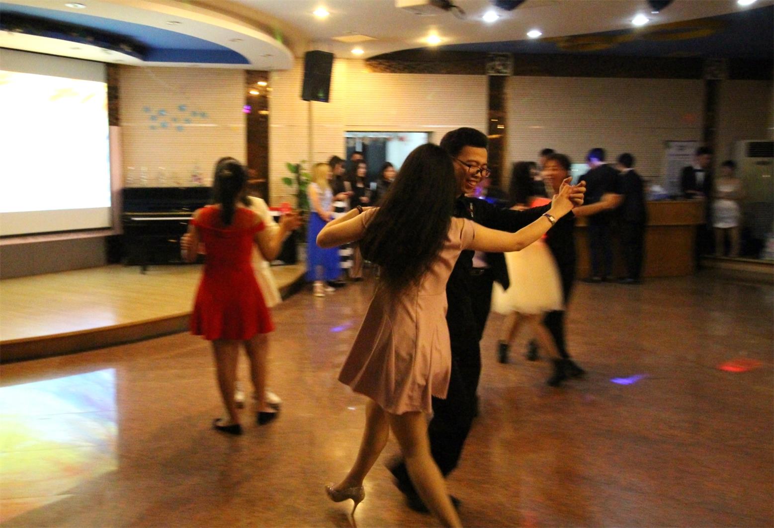 休息过后舞曲更是不歇,“兔子舞”一想起就是引得大家齐齐的聚到场中间围成一个环形,在欢快的节奏中搭着前面人的肩膀蹦蹦跳跳起来。同学们额头渗出汗来,兴致却是丝毫不减,笑声乐声脚步声一时交融在一起。最后一段长长“free dancing”也给了众多舞者自由发挥的时候,大家抓着最后的机会与自己的舞伴舞动起来。