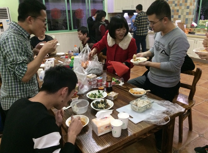 下午四点左右,大家带着买好的食材,一起来到26舍的毕至居,清扫了一下场地之后便开始了日租活动。对我们在校生来说,久违的厨房氛围立马燃起温馨的家庭气息,大家一个个都跃跃欲试,有的在清洗蔬菜,有的在剁饺子馅儿,有的在煮饭,“八仙过海,各显神通”,平日里的科研大牛摇身变为居家好帮手,都迫不及待地想为大家奉上美食。