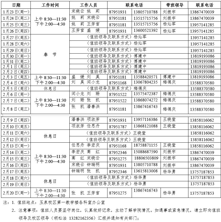 机械工程学院2017年寒假值班安排