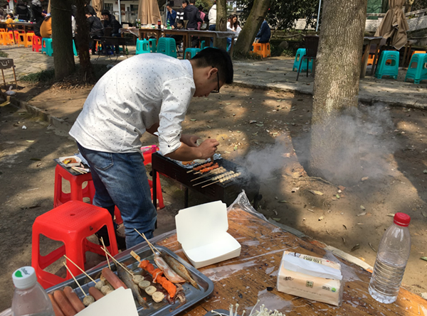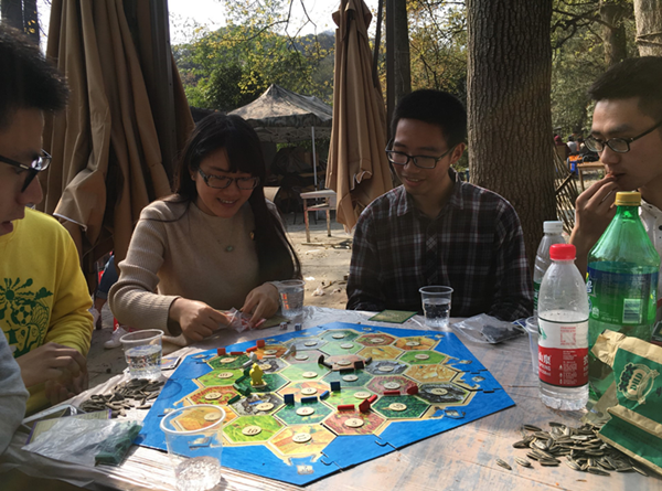 在一路美景的陪伴下,不知不觉中就来到了烧烤店。拿来卡坦岛桌游的郑文刚同学在给我们讲解完游戏规则后主动的承担起烧烤重任……,其余同学在激烈而不失友好的气氛下进行着游戏,品味着烤好的美味……,这一切都要感谢郑同学的辛苦付出。辛苦2个小时的郑同学终于加入了第二局,经过第一轮的熟悉之后,第二局果然顺畅了很多,团支书言华棋差一招,郑文钢取得了第二局最后的胜利。两局战罢,已近黄昏,周围炊烟寥寥,店家也要打烊了,在依依不舍中同学们结束了本次聚餐。