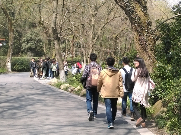 三月的杭城早早的进入了梅雨季节,本周末是一个难得的好天气,筹划三周之久的班级聚餐终于可以顺利成行了。班级人数少,固然队伍小了点,但是大家都很熟悉,玩的依然开心。周日早晨10:00,同学们准时从校门口出发,步行来到浙大附中公交站,连日的阴雨,让同学们今天都穿了较厚的衣服,没走几步,大家便感受到了天气的炎热……幸运的是,我们都顺利的登上的发往九溪的公交车,经过一路的拥挤终于到达目的地——九溪。来到九溪站,只走了一小段路,便见到了这令人猝不及防的美景,刚刚还处在繁华都市,这一刻,即体味到了山水美景,静静的山谷,叮咚的小溪……。沿山路走进九溪,路旁都是绿油油的茶田,茶田里好多结伴而来友人们在拍照留念,空气中也飘散着清香的茶味。