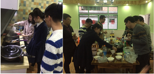 气氛调节组成员玩的十分欢脱,但是一旁“打下手”的食材洗切组却丝毫不受影响,你择青菜,我切土豆,他切肉片,大家各司其职,忙的不亦乐乎。平常在家没怎么打过下手的同学也饶有兴趣地加入洗切组,跟着“生活”经验丰富的同学学“技术”。很快,各种食材都被洗好、切好、装盘。接下来就是大厨们的“天下”了,帅气的于同学烧鱼,热情的黄同学炒麻辣香锅,温柔的代同学负责炒大盘鸡,“硬菜”、素菜络绎不绝的下锅,出锅,熟菜一上桌面立马引起大家的哄抢,每道菜基本都被一抢而光,大家吃的开心同时,不由自主的对大厨们竖起大拇指:味道很棒。这让一边忙碌的大厨们也十分高兴,大家的喜爱就是对他们最好的肯定和鼓励,还有平时不怎么做菜的同学,下厨一展身手,大家互相指导,日租屋里一派其热融融。