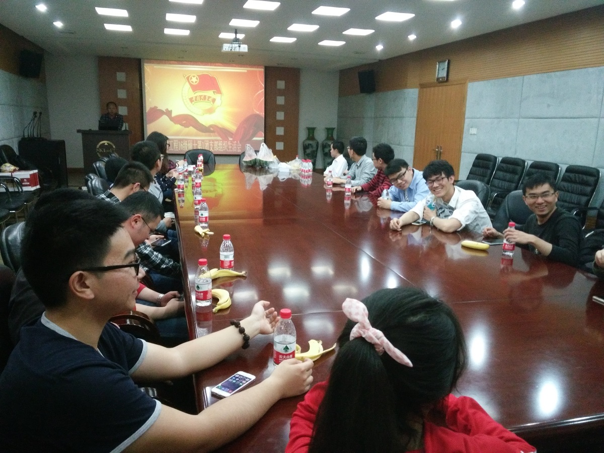 会议召开之前,在团支书带领下,另外几个班委一起布置会议教室,为大家购买水果和矿泉水等并分发于每个座位上。下午2点,人员到齐之后,团支书宣布会议正式开始。