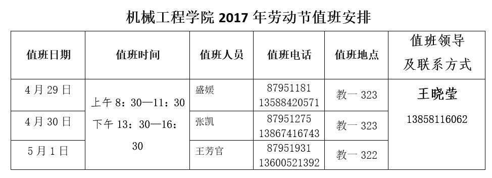 机械工程学院2017年劳动节值班安排