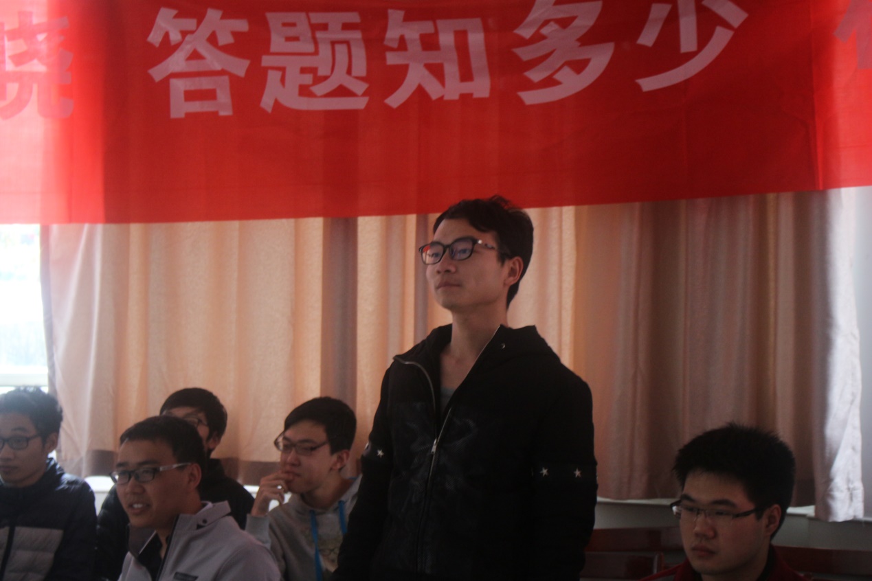 随着主持人的宣布开始,我们的知识竞赛进入第一个环节“必答题”,每道题只有30秒的答题时间,答对得5分,答错不扣分。第一队的队长率先站起来迎接挑战,第一题很简单,队长轻松取得首计得分,接下来第二题稍微有了一点难度,但还是难不倒我们的机械学子们,稍加思索后,一队队长给出了正确的答案,随着题目难度的逐步加深,答起题来也是越来越费力,经过一番答题,各个队伍也都取得了比较满意的成绩。进入了第二环节“独当一面”,每次只能有一名队员上场答题,答错则下场,由另一名队员接力答题,不约而同的,我们的参赛队伍选出了自己的队长挑起大梁,首先迎接挑战。这一轮的题目难度相对第一轮有所加深,各队队长也在答完两三题后败下阵来,由自己的组员负责接力答题,一番答题之后,可惜的是,二组队员已全部上场,失去继续后面几道题目的答题资格,遗憾的丢失了得分的机会。