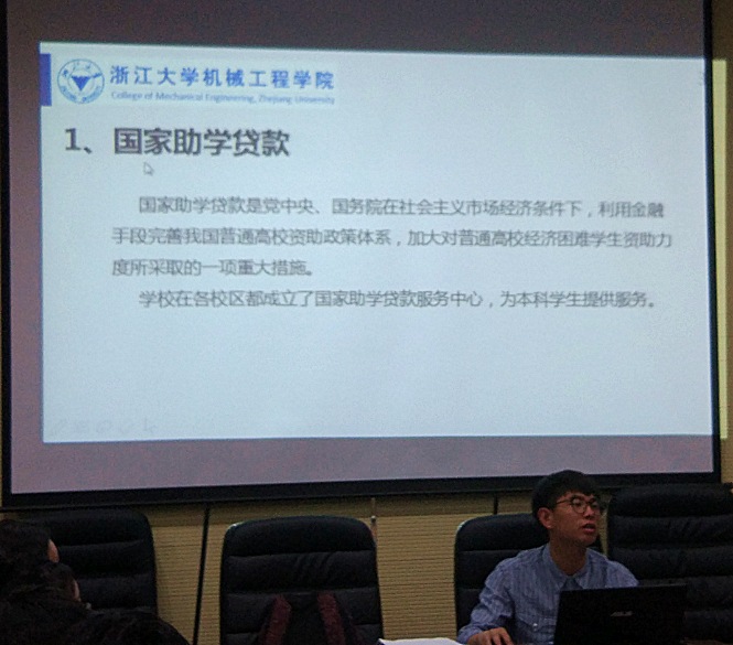 首先,胡侃鑫为大家详细介绍了浙江大学主要的学生贷款类型,包括国家助学贷款、校内无息贷款和永平自立贷学金等等。他重点讲解了各贷款的申请条件、申请金额,申请时间以及还贷要求。其中,国家助学贷款和校内无息贷款都要求只有经济困难生才能申请,但是永平自立贷学金没有此项要求。在其他申请条件里,胡侃鑫针对永平自立贷学金中“无学术不信行为”这一要求进行了扩展阐述。他指出:“学术诚信也是诚信中的重要一环,也是最容易被忽视的一环,大家在做毕业设计、科研项目时一定要十分重视学术诚信,不要以为将百度的内容直接使用无伤大雅。”而在还贷要求中,不同类型贷款的还贷期限、时间点是不一样的,胡侃鑫同学提醒大家要重点注意。