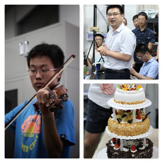 欣赏完实验室自导自演的节目后,本次活动也进行到了尾声,我们邀请到了浙江大学研究生艺术团的楼一杰同学,他给我们带来了一首小提琴独奏《爱的致意》,让本次活动有了更新的体验。最后,在楼一杰同学的第二首独奏《生日快乐》中,我们拉出了生日蛋糕,一同齐唱生日快乐歌,为傅建中老师庆祝生日,场面感人至深。