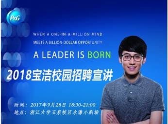 宝洁公司将于9月28号在玉泉校区永谦小剧场举办校园招聘宣讲会,同时,也为同学们准备了精美的礼物。招聘宣讲会:9月28日浙大 玉泉永谦小剧场,届时众多宝洁浙大校友高管也会亲临现场,让同学们进一步认识宝洁。日期时间活动地点校园招聘 宣讲会 2017/9/2818:30 - 21:00产品供应部,品牌管理部,财务部,销售部,研究开发部 浙江大学玉泉校区 永谦小剧场 同学们也可以关注“浙大pgclub”公众号获取最新的宣传信息。