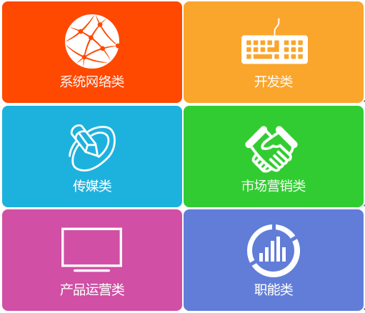 招聘职类:系统网络类,开发类、传媒类、市场营销类、产品运营类、职能类六大岗位类别