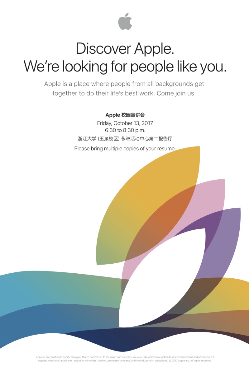 欢迎来到我们的宣讲会现场,了解更多关于Apple公司、招聘职位的介绍。更有机会和Apple HR以及资深经理们零距离沟通,聆听他们对于Apple职位申请、职业发展的建议和工作经验的分享。