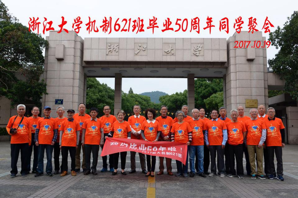 19日,校友们兴高采烈的来到了母校的历史发源地——求是园,他们激动的穿上印有“我们毕业50年啦!”的文化衫,拉着“我们毕业50年啦!—1967-2017浙大机制621班”字样的横幅,在校大门、毛主席像前和挂有“热烈欢迎机制621班校友毕业50周年重返母校”横幅的教一前,留下一张张精彩的合影。校友们来到曾经上过大课的教一234教室,重新感受一次学生时代的美好。他们来到在曾经住过6年的七舍,寻觅青春的印记,熟悉的石阶、泛黄的墙皮、斑驳的房门,就连窗外的老树、嘈杂的鸟儿都仿若昨日,仿佛浙大校园中的少男少女还未曾离去,时光留驻、深情永存,当年的青涩与奋发与如今的耄耋与矍铄完美的融合在一起,让人平添感慨。