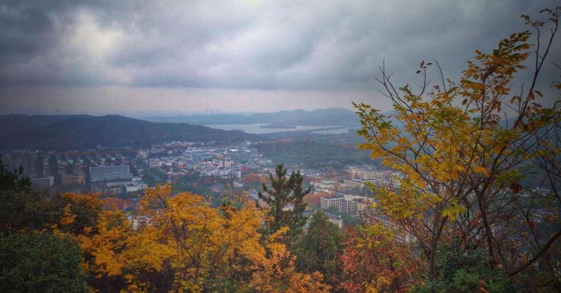 中午12点30分,方芳和叶建芳老师在老和山山顶右手边的凉亭为参与人员进行签到工作,签到工作进行的非常顺利。率先到达的教职工在山顶凉亭里休憩,或彼此畅聊此次登山的感受,或举目远眺,欣赏山下城镇和西湖美景,用相机记录下山中还留有的别样秋景。