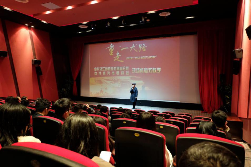 在纪念馆二楼影视厅,师生一行认真观看了《红船》专题片。专题片制作精良,发挥出现场体验式教学的优点,从视觉与听觉上,给师生带来一场生动的感官享受和心灵触动。