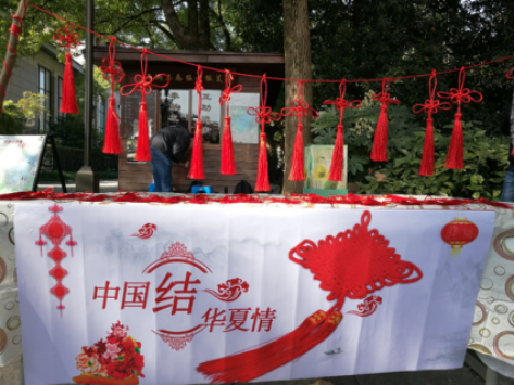 12月9日一早,志愿者就赶到了位于白堤上的平湖秋月微笑亭。与微笑亭的老志愿者们进行了沟通交流之后,志愿者们开始着手布置活动场地,就地取材,捡起地上的树枝搭起一个展架,将提前准备好的中国结挂在绳子上,剩余的平铺在桌子上。新颖的展架吸引了不少的游客,很快,志愿者们就忙碌起来了。活动的志愿者主要分为三组,分别负责教游客编织中国结、与游客进行问答互动及让游客挑选题目答对之后的礼物,礼物是志愿者们之前做好的中国结。