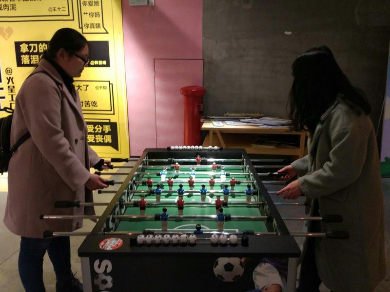 我们一行人中的两名女生貌似对桌上足球很感兴趣,一进门就被它吸引了,玩了半个多小时,直到手酸腰酸才不舍地离开。
