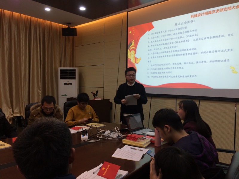 12月9日机设模具党支部开展了关于讨论许增辉同志和施文骏同志转正申请的会议,会议主要由支部副书记主持。此次会议严格按照中国共产党章程开展,会前清点与会人数,确保到场的正式党员超过本支部正式党员的2/3,本次会议支部全体党员均到场,支部副书记简单介绍会议流程后,会议正式开始。