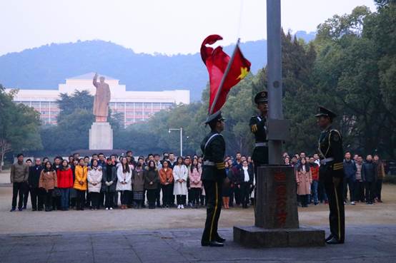 2017年12月26日——毛泽东诞辰124周年,机械工程学院与玉泉校区国旗班一起,举行简朴而隆重的升国旗仪式暨红色记忆寻访活动。追溯历史,缅怀先辈,铭记往昔,继续前进,进一步学习贯彻党的十九大精神和习总书记新时代中国特色社会主义思想,引导广大团员青年积极培育和践行社会主义核心价值观。浙江大学机械工程学院团委书记王芳官老师,团委副书记刘珊老师,辅导员张俞彬老师以及机械工程学院全体团学干部和班长团支书参与本次活动。