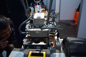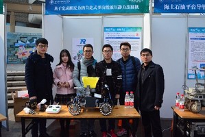 本机器人是为了清洗海上石油平台上附着的海生物而研发的,因为海上石油平台清洗的成本比较高,每次清洗需要100多万,浪费大量的人力、物力,所以本团队萌发了研发了石油管道机器人的想法。这台机器人利用磁力吸附,吸附在钢管的表面,前轮转向,前后轮同时驱动,清洗采用高压水枪,此高压水枪采用压力产生的空化的气泡爆炸来清洗,这不同于普通的高压水枪,所以效率比较高。这台机器人是国内领先的专门用于海上石油平台导管的清洗机器人。
