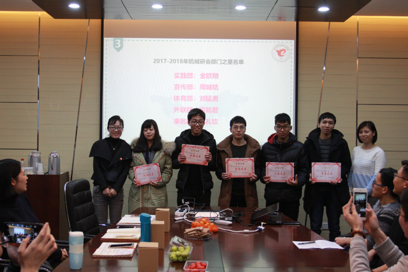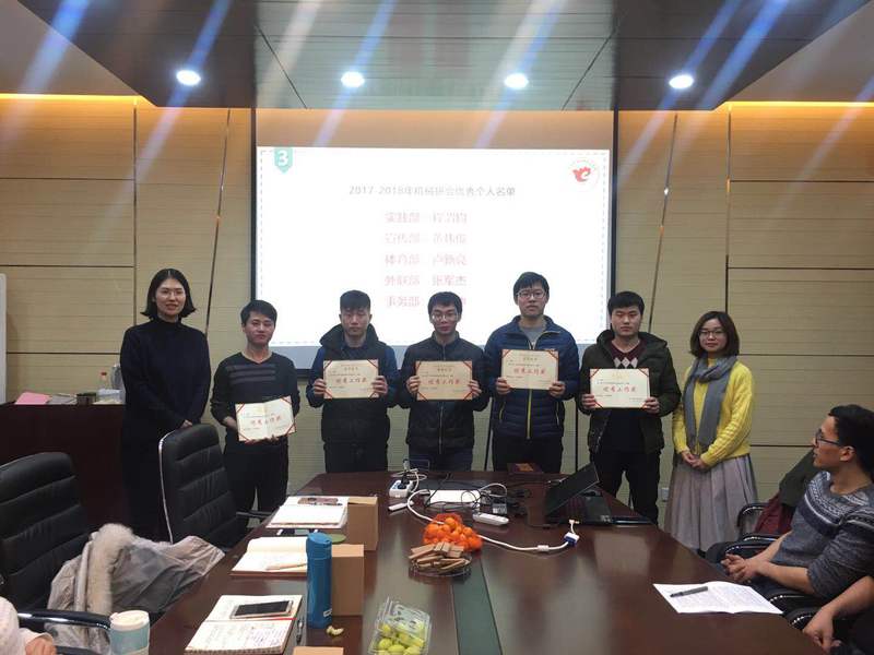 2018年1月23日,在这个新旧交替,新春将至的日子里,浙江大学机械工程学院第三十四届研究生会总结表彰会议在第一教学大楼411室举行。出席本次会议的有团委王芳官、任思丹、张榆彬、刘珊等四位老师,以及学院研究生主席团成员及各部门的成员。本次会议由研会副主席余秀主持。