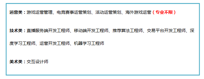 运营类:游戏运营管理、电竞赛事运营策划、活动运营策划、海外游戏运营(专业不限) 技术类:直播服务端开发工程师、移动端开发工程师、推荐算法工程师、交易平台开发工程师、深度学习工程师、运营开发工程师、机器学习工程师 美术类:交互设计师 |
