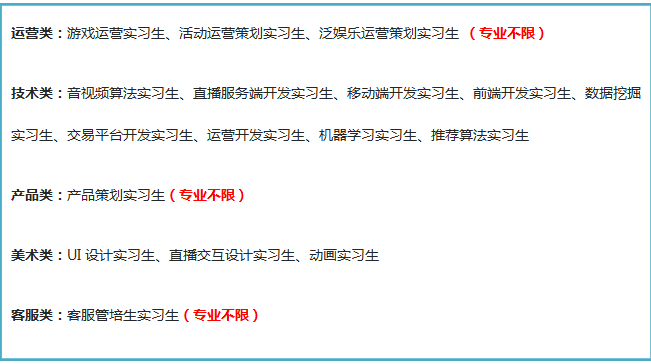 运营类:游戏运营实习生、活动运营策划实习生、泛娱乐运营策划实习生 (专业不限) 技术类:音视频算法实习生、直播服务端开发实习生、移动端开发实习生、前端开发实习生、数据挖掘实习生、交易平台开发实习生、运营开发实习生、机器学习实习生、推荐算法实习生 产品类:产品策划实习生(专业不限) 美术类:UI设计实习生、直播交互设计实习生、动画实习生 客服类:客服管培生实习生(专业不限) |