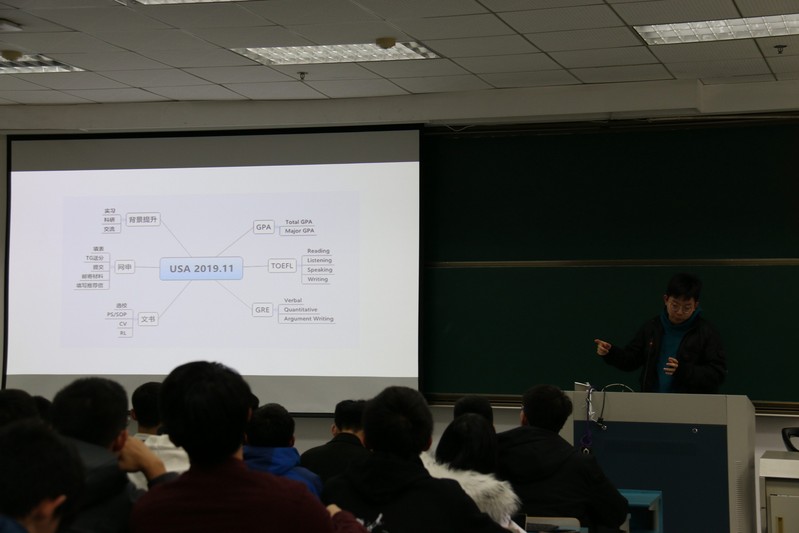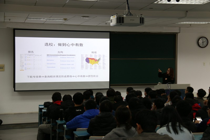 最先上台的李蔚和王思阳两位同学分别就北美留学情况的前期调查和具体准备两方面进行了详细的介绍,不但给大二的同学们规划了出国准备时间表,而且对每一步的关键问题进行了耐心的解答。