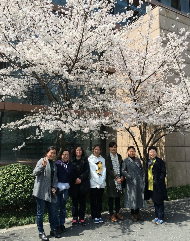 中午12点,上午的课程已结束,女老师们信步前行,一边欣赏着校园美景,一边向着“求是大讲堂”散步。一路上,早樱茂盛,一片洁白;晚樱刚刚露出粉色的花蕾;紫荆花却是已经爬满了树枝,展露傲人的色彩。老师们一边走一边用手机记录下春天的美景。