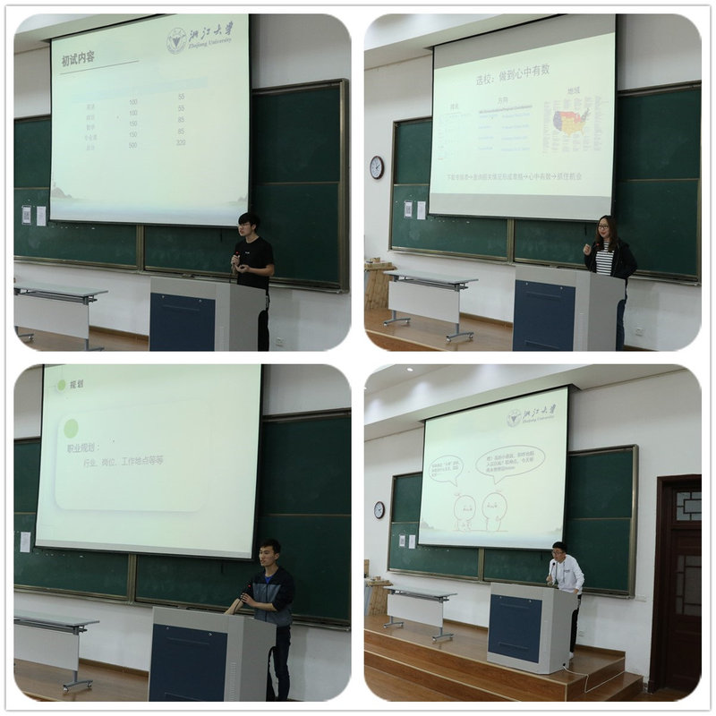 而后,主修机械工程专业,辅修竺可桢学院公共管理强化班,目前已保研本院的严锦文同学向学弟学妹们分享了当下这个关键时刻如何调整自己的心态,做出适合自己的人生规划和选择的心路历程和经验;以复试第一成绩考入本院图形所攻读硕士学位的张会轩同学分享了他的考研准备、笔试及面试中的技巧与心得;全程DIY完成美国硕士申请即将留学美国的李蔚同学和即将就读佐治亚理工学院的王思阳同学传授了留学申请过程中需要注意的点点滴滴,并将许多重要的网站和资源平台分享给了大家;就业经验丰富即将入职普联技术的杨辉同学详细介绍了获取一份称心如意offer的必需准备;以专业第一的成绩保研本院的李东升同学讲解了保研的各种前期准备、过程中所需的技巧与心得等。学长们毫无保留的经验分享博得了同学们的赞叹与掌声。