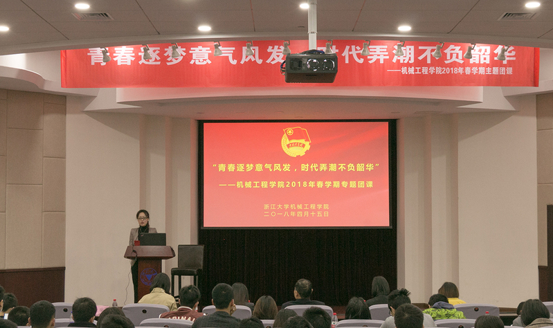 2018年4月15日上午,机械工程学院于玉泉校区邵逸夫科技馆召开主题为“青春逐梦意气风发,时代弄潮不负韶华”2018年春学期主题团课。本次团课特邀浙江大学团委书记沈黎勇老师主讲。机械工程学院党委副书记项淑芳老师,团委书记王芳官老师,团委副书记任思丹老师,团委副书记刘珊老师,以及学院全体学工干部、班长、团支书以及各个党支部书记参加了本次团课。活动由辅导员张瑜彬老师主持。