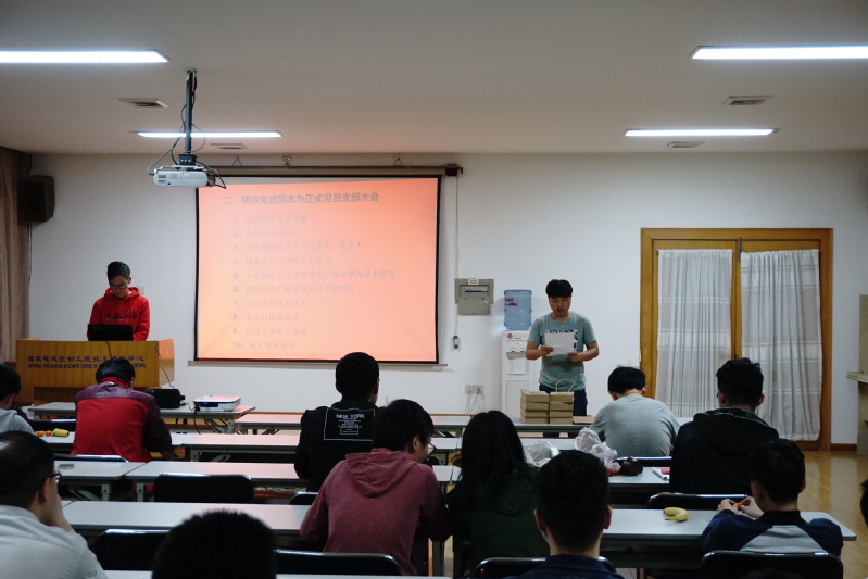二、预备党员朱武同志上台宣读转正申请书。朱武同志汇报了其在预备期间的思想、科研、生活等方面的表现情况,指出了自身仍然存在的不足,以及日后改进的方向。