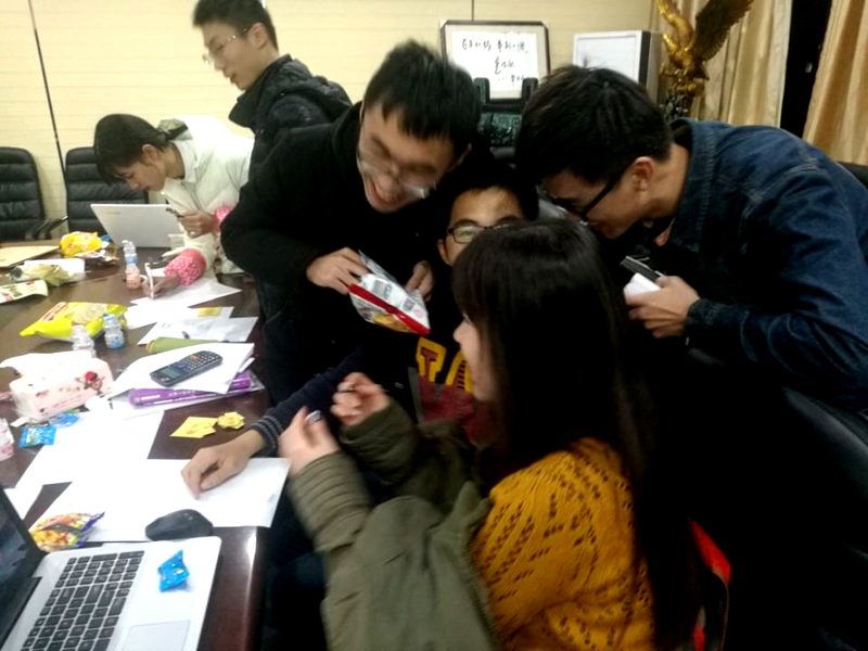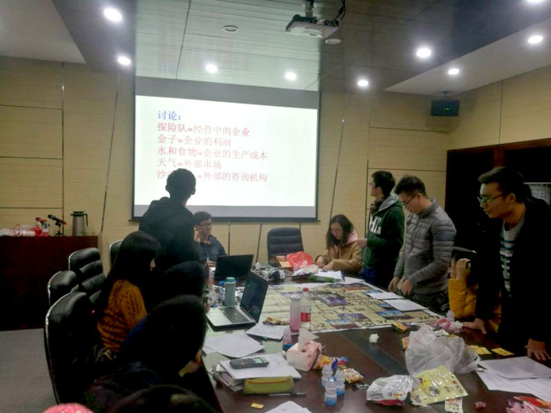 在简单介绍游戏规则后,大家3人一组,分成四组,由机械1504班班长和团支书作为“培训师”来保证游戏进度和指引玩家。在对于规则进行了一番撤透的讨论后,四个小组分别选定了自己的游戏策咯,购买好虚拟物资,游戏开始。