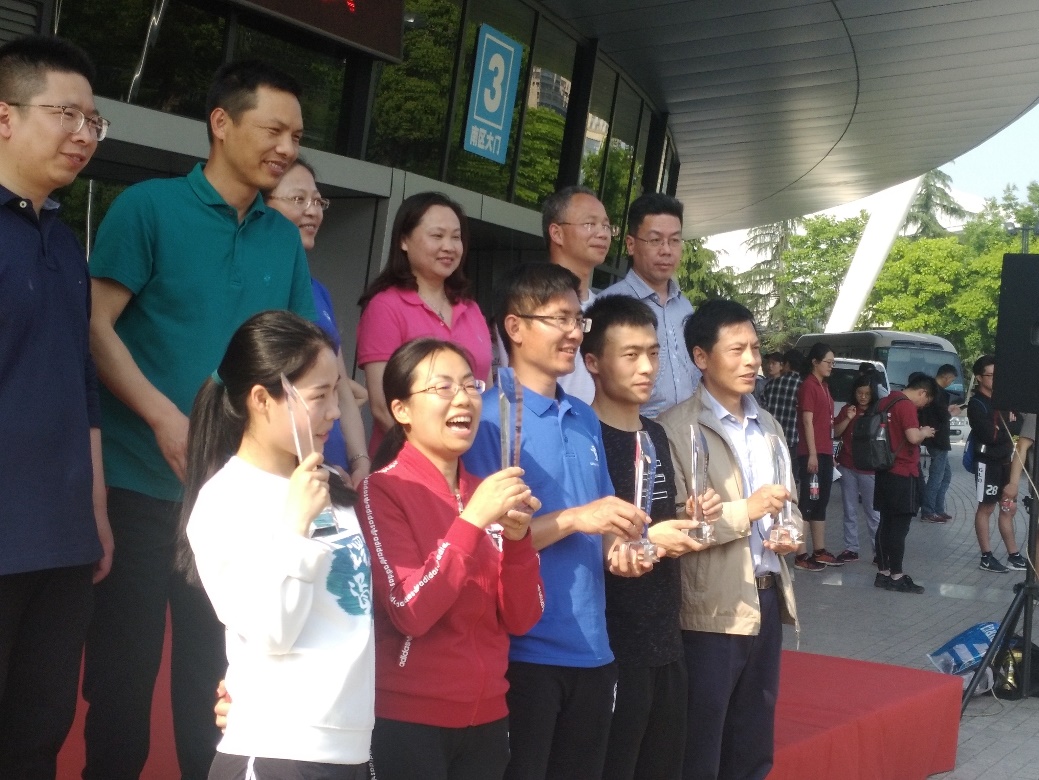 比赛当天艳阳高照,晴空万里,接近30℃的高温仿佛在与赛场上的激情斗志遥相呼应。在赛事正式开赛前,比赛组委会为2017年本科生、研究生体育比赛总成绩前八名的院系、单位颁发了荣誉奖杯,同时,还为教职工羽毛球、乒乓球和篮球比赛前八名颁发了奖杯。其中,我院获得2017年研究生组校运会第一名以及年度体育比赛综合成绩第二名的优异成绩,并由在上届校运会中大放异彩的焦中栋博士生作为代表,上台领取获奖奖杯。