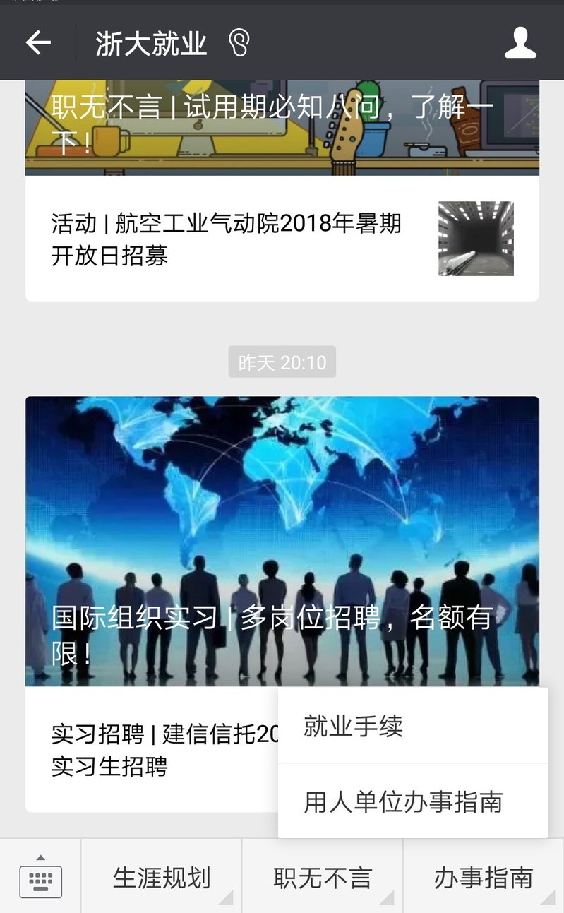 搜索名称“浙大就业”或微信号“zjujyzx”,即可关注。该微信公众号是浙江大学就业指导与服务中心官方微信,独家发布浙江大学就业指导与服务中心各类就业、创业资讯,同时提供就业创业指导、政策咨询、就业管理等全方位服务信息。里面除了各类实习、就业的信息及时发布外,还有实用的版块有“生涯规划”、“职无不言”、“办事指南”。其中办事指南包括“就业手续”和“用人单位办事指南”,这些都是同学们常问到常用到的热点信息。请大家积极关注!