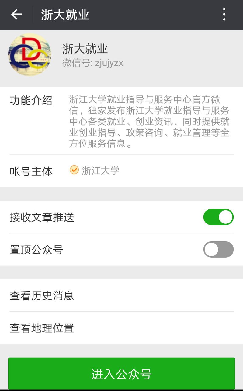 搜索名称“浙大就业”或微信号“zjujyzx”,即可关注。该微信公众号是浙江大学就业指导与服务中心官方微信,独家发布浙江大学就业指导与服务中心各类就业、创业资讯,同时提供就业创业指导、政策咨询、就业管理等全方位服务信息。里面除了各类实习、就业的信息及时发布外,还有实用的版块有“生涯规划”、“职无不言”、“办事指南”。其中办事指南包括“就业手续”和“用人单位办事指南”,这些都是同学们常问到常用到的热点信息。请大家积极关注!