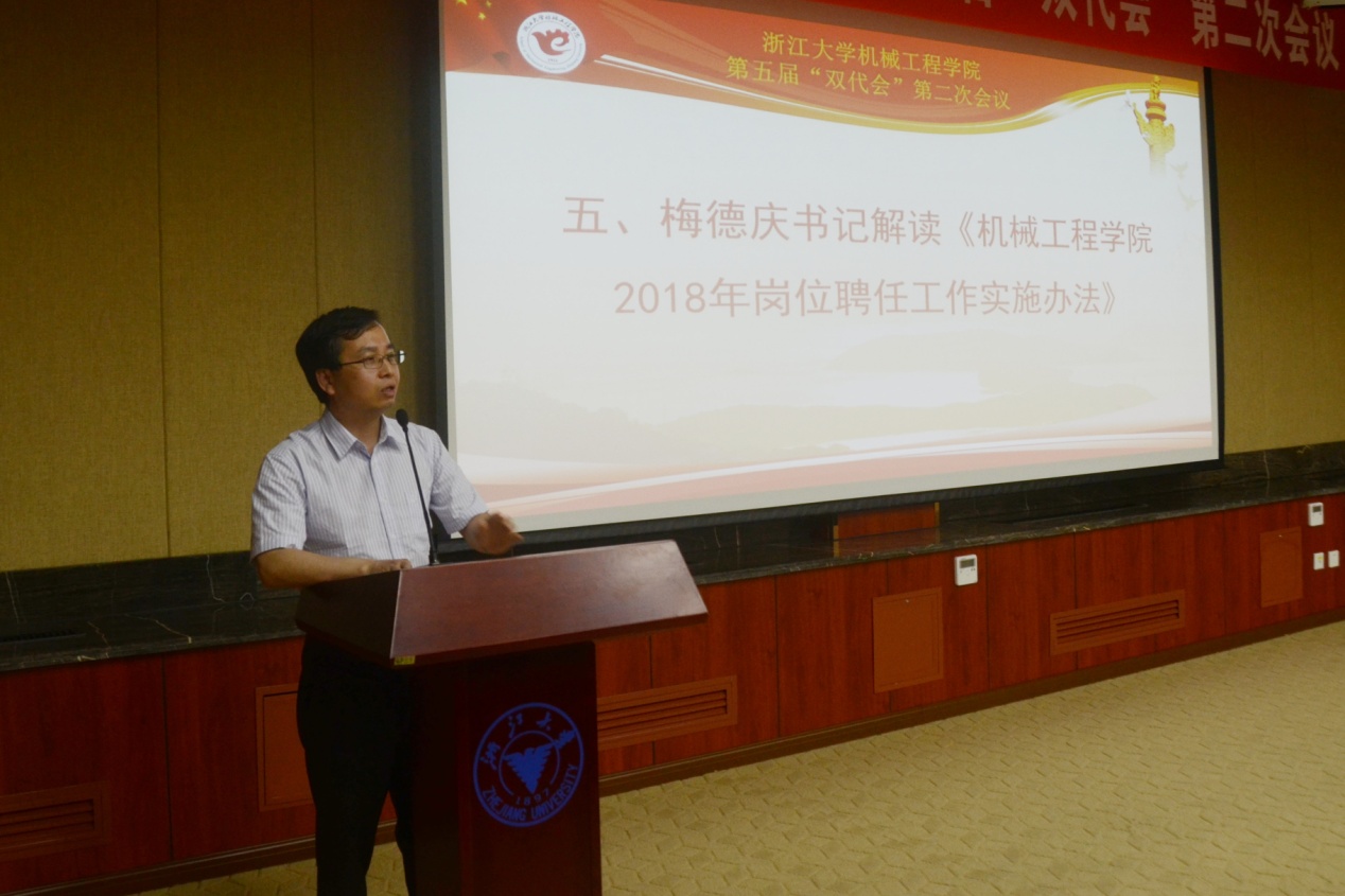 党委书记梅德庆教授解读《机械工程学院2018年岗位聘任工作实施办法》,带领大会全体代表进行了认真地审议。随后,采取举手表决的方式,在座代表对《机械工程学院2018年岗位聘任工作实施办法》进行了表决,全票通过。