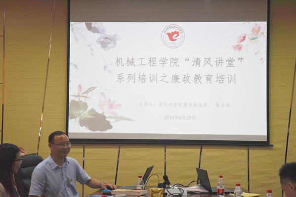 2018年6月29日,在党的生日来临之际,机械工程学院为了加强纪检干部的履职尽责能力,提升党政干部的思想政治素质,特邀学校纪委办副主任张士良做客“清风机械”讲堂,开展廉政教育专题培训。学院党委书记梅德庆、副书记兼纪委书记项淑芳,学院全体纪委委员,各教工党支部书记,学生党支部书记等参加培训。培训会由项淑芳老师主持。