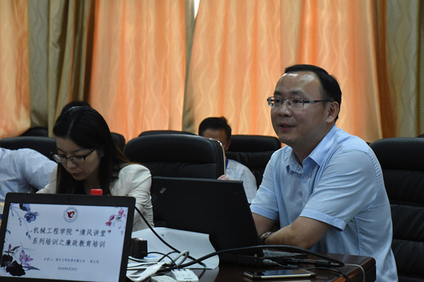 2018年6月29日,在党的生日来临之际,机械工程学院为了加强纪检干部的履职尽责能力,提升党政干部的思想政治素质,特邀学校纪委办副主任张士良做客“清风机械”讲堂,开展廉政教育专题培训。学院党委书记梅德庆、副书记兼纪委书记项淑芳,学院全体纪委委员,各教工党支部书记,学生党支部书记等参加培训。培训会由项淑芳老师主持。