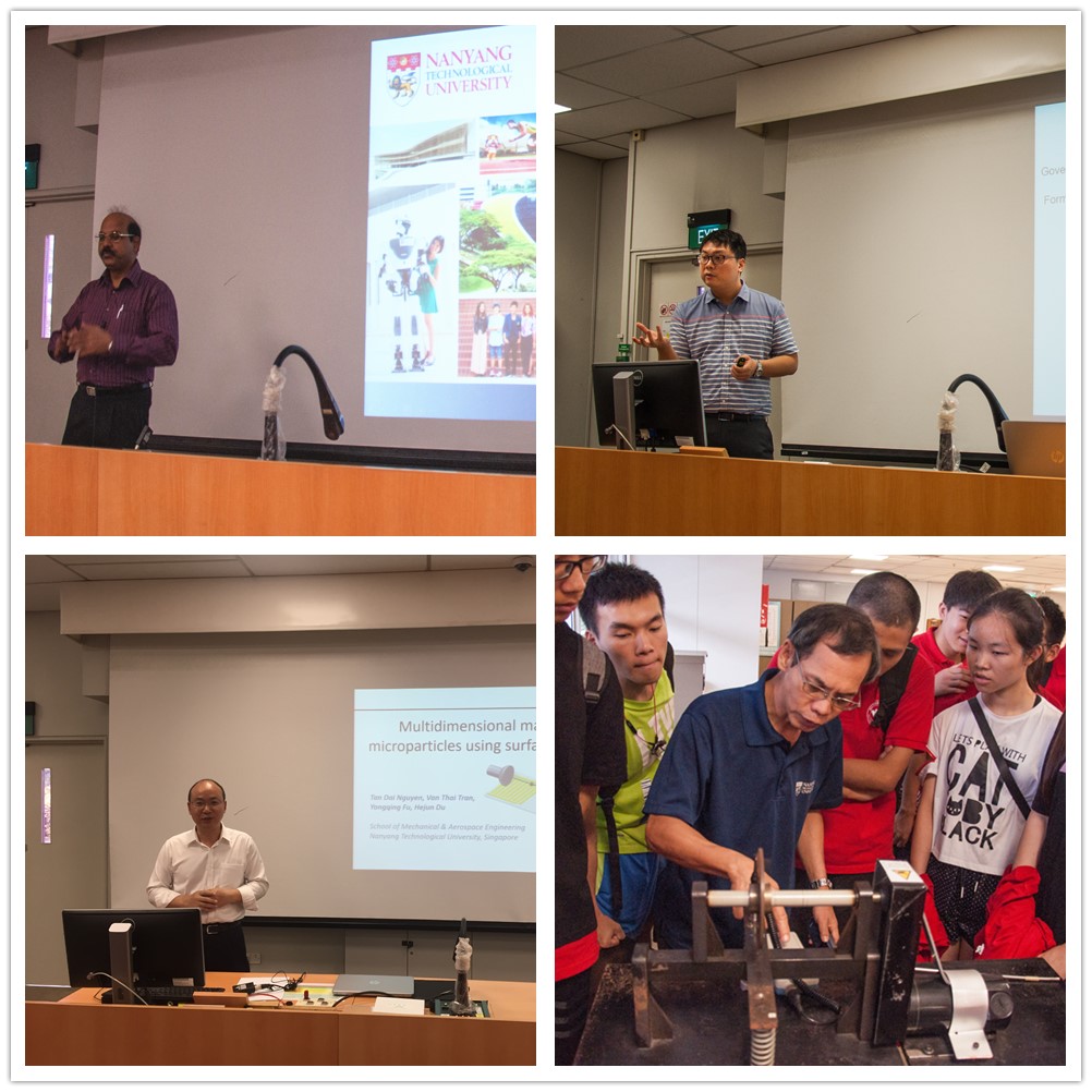 在南洋理工大学(NTU, Dr Sunil Chandrakant JOSHI PhD MTech Associate Chair(Academic), Associate Professor School of Mechanical and Aerospace Engineering NTU莅临现场致辞,欢迎同学们来到新加坡南洋理工大学,并对学校和学院的基本情况做了简要介绍,希望同学们将来可以选择NTU继续深造。Dr lum Guo Zhan PhD and Dr Hejun DuAssociate Professor,分别为同学们带来了两场精彩纷呈的学术报告,报告围绕不同主题展开,涉及机器人等机械学术发展前沿,讲座思路新颖,具有很高的学术价值,同学们听得津津有味,在报告结束后大家踊跃举手提问,两位老师一一做了详尽解答,并对同学们的积极提问表示赞赏。当天,交流团还在Dr Hejun Du的带领下,参观了NTU校园和机械相关的一些实验室,先进的实验装备和创新的学术文化氛围、以及人性化的校园建筑设计等等,同学们纷纷赞叹不已。
